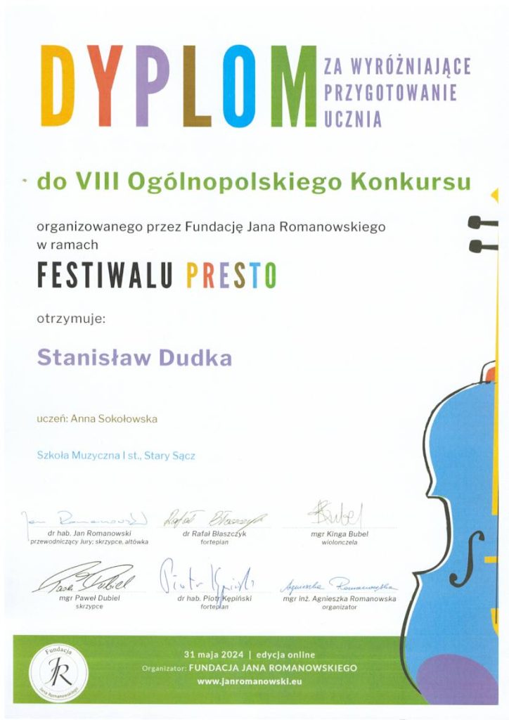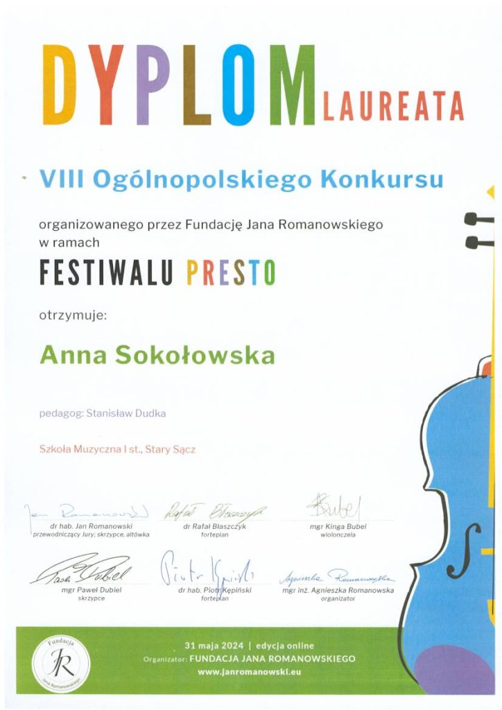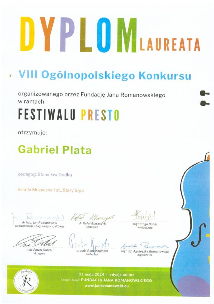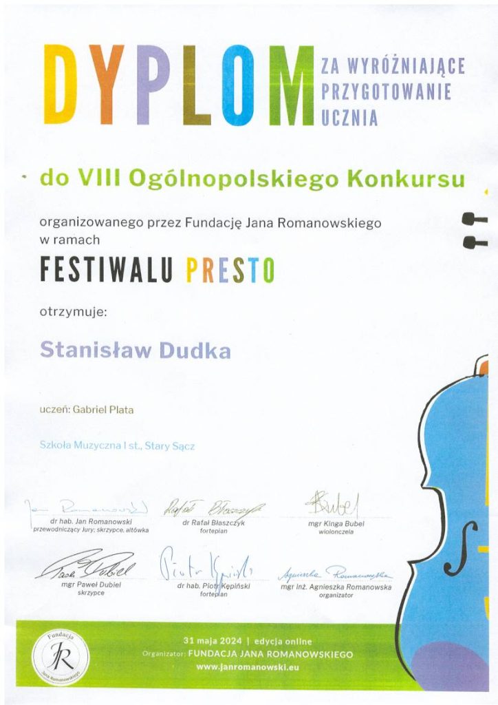 Gabriel Plata kl. II/6 i Anna Sokołowska kl. IV/4 uczniowie klasy skrzypiec pana Stanisława Dudki zostali Laureatami VIII Ogólnopolskiego Konkursu organizowanego przez Fundację Jana Romanowskiego. Pan Stanisław Dudka otrzymał dyplomy za wzorowe przygotowanie uczniów do konkursu.