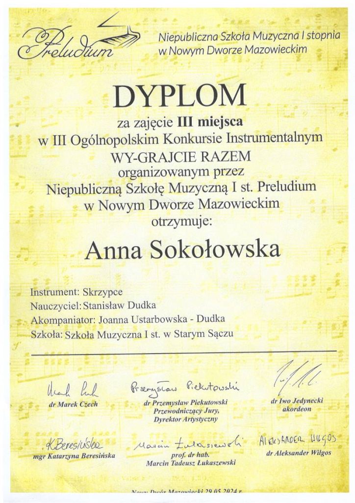 Uczniowie z klasy skrzypiec pana Stanisława Dudki wzięli udział w III Ogólnopolskim Konkursie Instrumentalnym WY-GRAJCIE RAZEM w Nowym Dworze Mazowieckim.