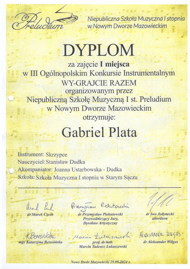 Gabriel Plata z klasy II cyklu sześcioletniego zdobył I miejsce, a Anna Sokołowska z klasy IV cyklu czteroletniego III miejsce.