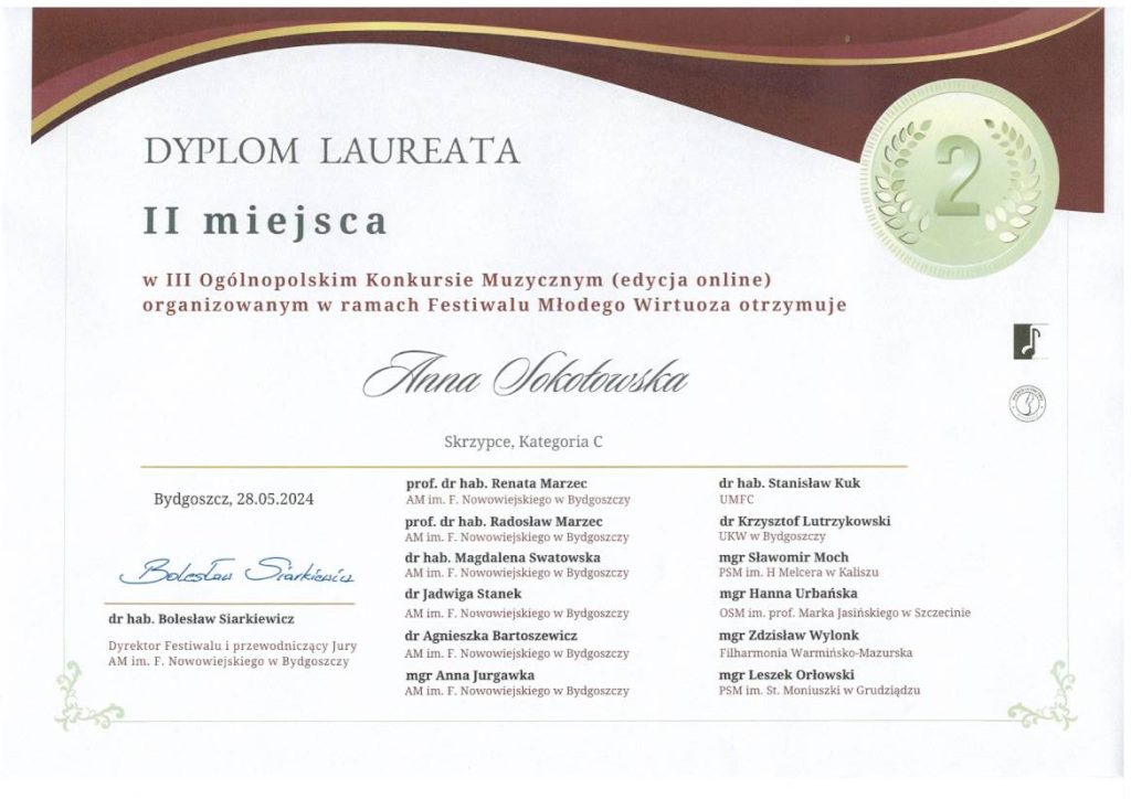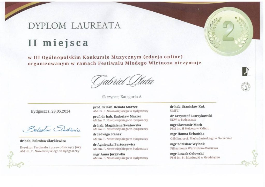 Uczniowie klasy skrzypiec pana Stanisława Dudki otrzymali nagrody w III Ogólnopolskim Konkursie Muzycznym organizowanym w ramach Festiwalu Młodego Wirtuoza w Bydgoszczy.