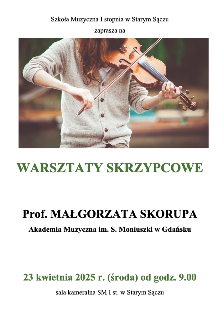 W dniu 23 kwietnia 2025 r. (środa) od godz. 9.00 w sali kameralnej SM I st. w Starym Sączu odbyły się warsztaty skrzypcowe dla uczniów klasy skrzypiec. Była to niepowtarzalna okazja do doskonalenia swoich umiejętności pod okiem wybitnej prof. Małgorzaty Skorupy.