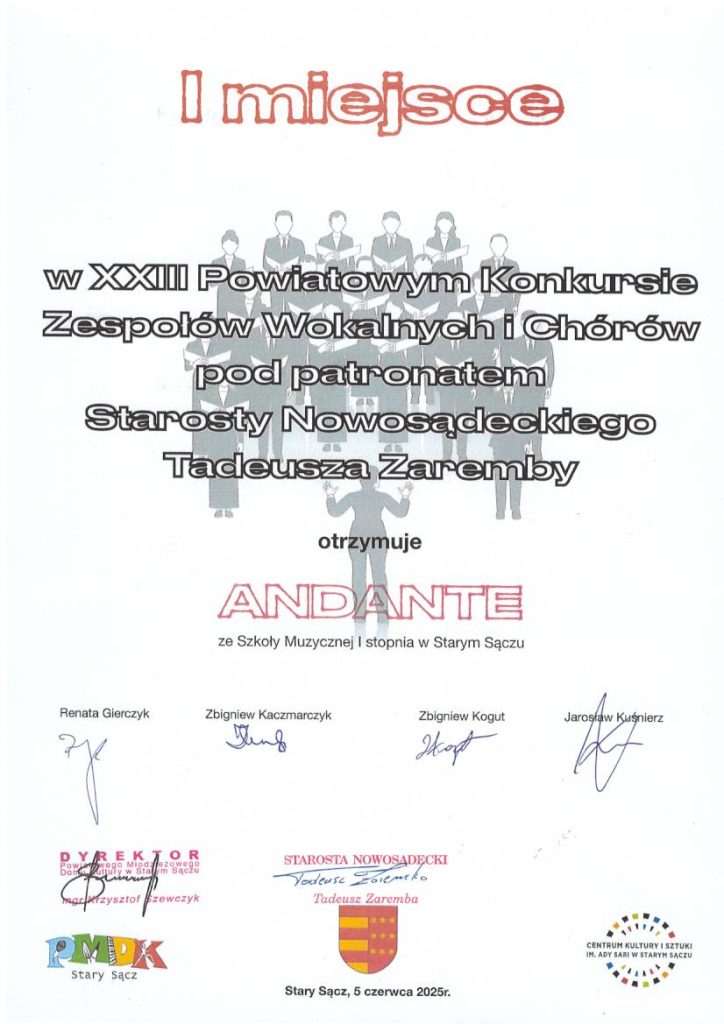 Zespół wokalny ,,Andante” prowadzony przez pana Leszka Moryto w dniu 05 czerwca 2025 r. zdobył I miejsce w XXIII Powiatowym Konkursie Zespołów Wokalnych i Chórów pod patronatem Starosty Nowosądeckiego Tadeusza Zaremby.