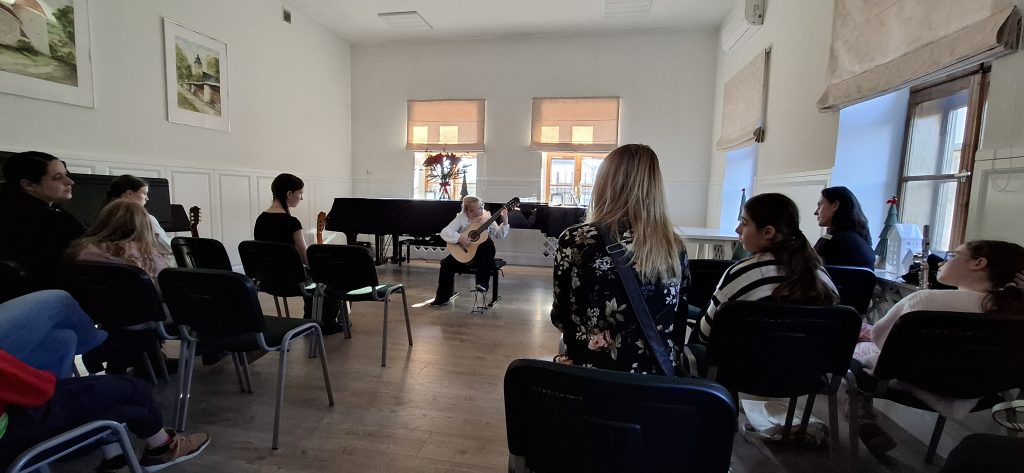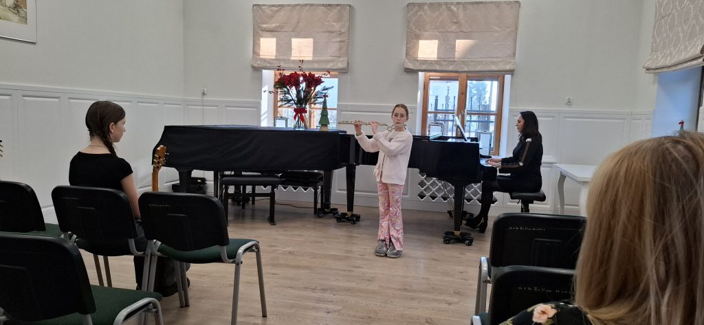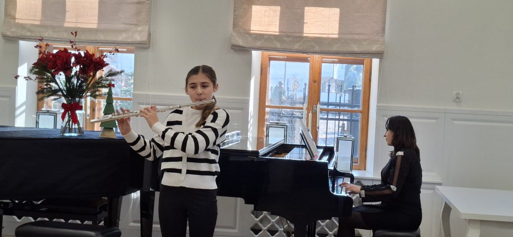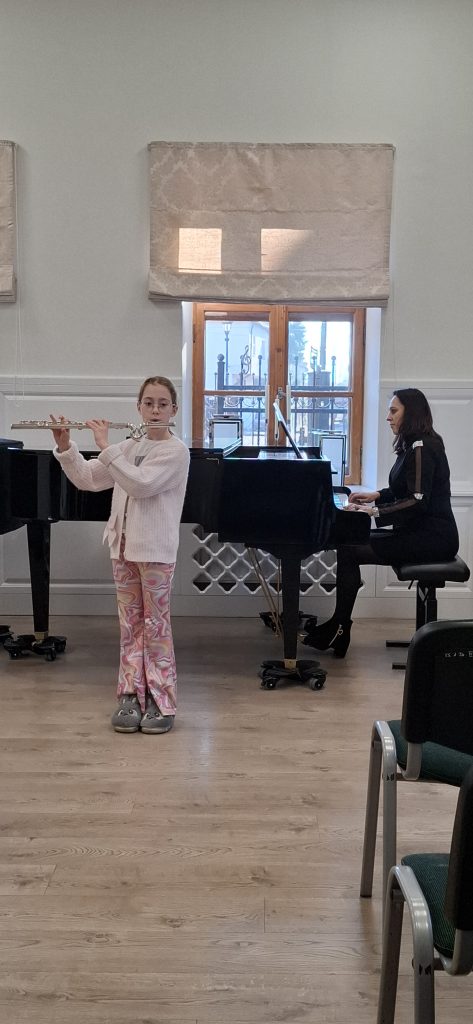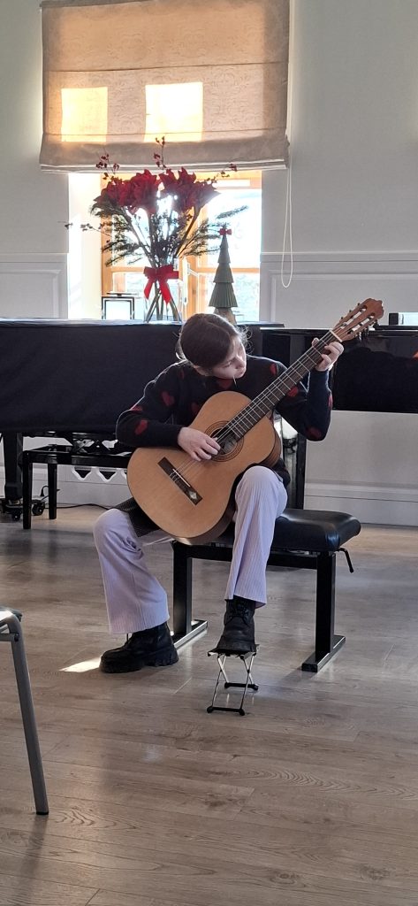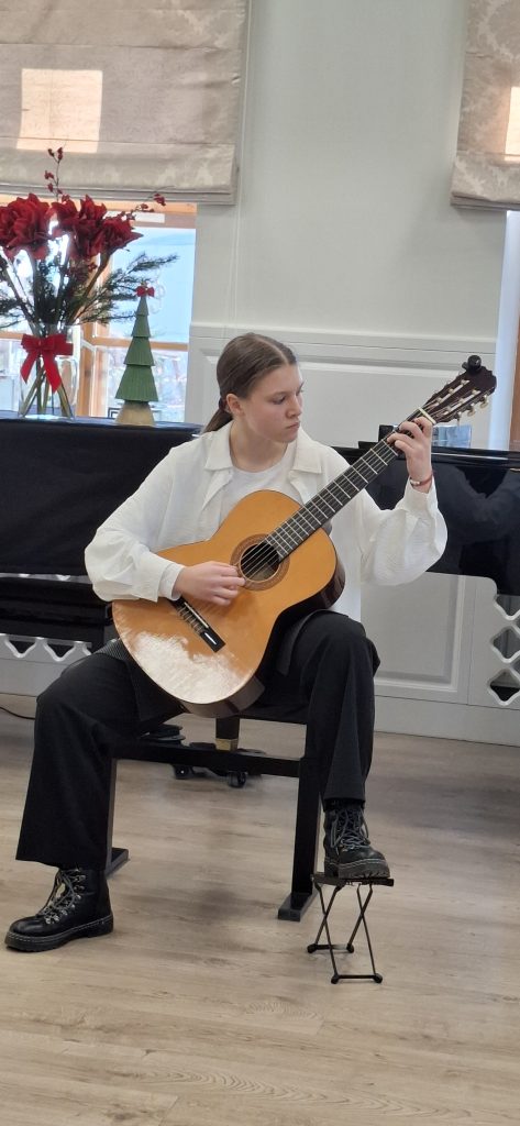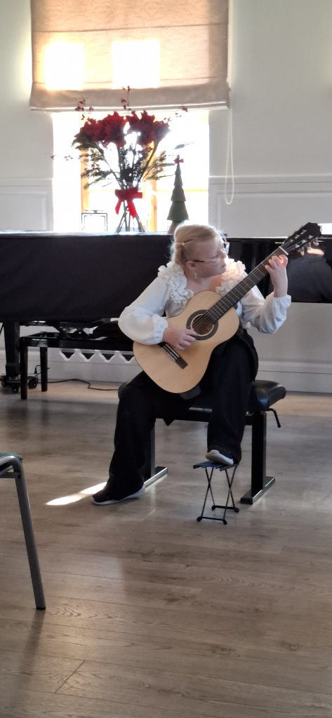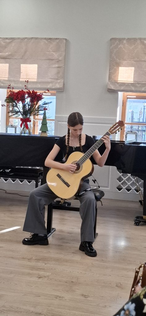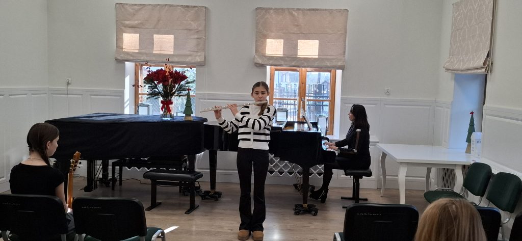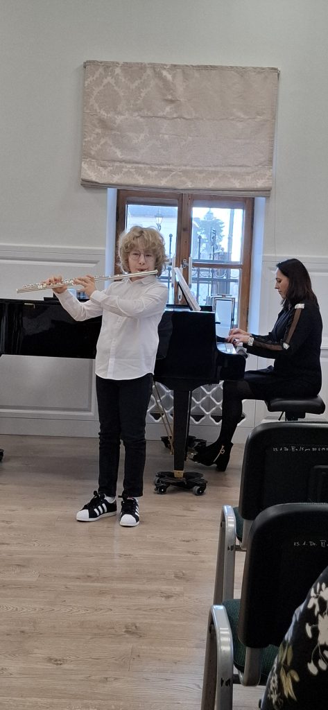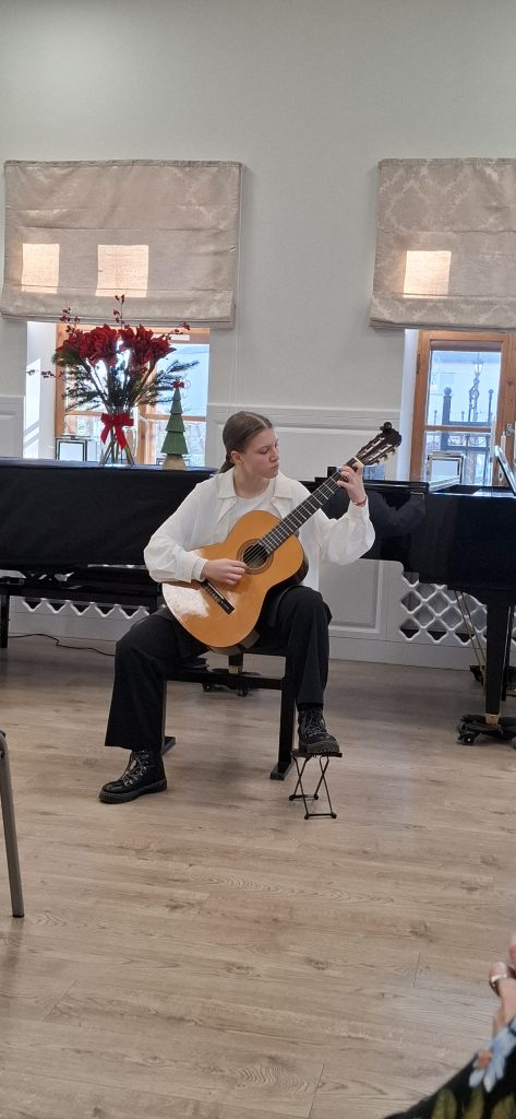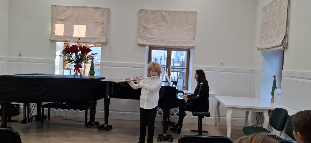 W dniu 13 grudnia 2025 r. o godz. 11.30 w sali kameralnej SM I st. w Starym Sączu swoje umiejętności zaprezentowali uczniowie klasy fletu i gitary .