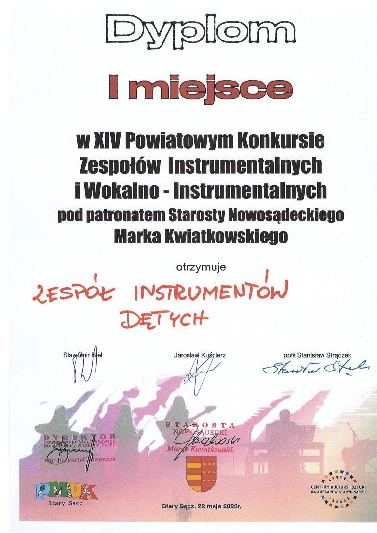 Zespół Instrumentych Dętych ze Szkoły Muzycznej I stopnia w Starym Sączu i Szkoły Muzycznej I stopnia w Łącku prowadzony przez pana Georga Weissa zdobył w dniu 22 maja 2023 r. I nagrodę w XIV Powiatowym Konkursie Zespołów Instrumentalnych i Wokalno-Instrumentalnych pod patronatem Starosty Powiatowego Marka Kwiatkowskiego. W składzie zespołu znaleźli się następujący uczniowie naszej…