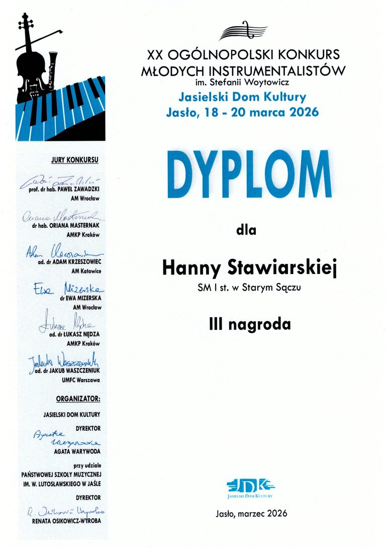 Podczas XX Ogólnopolskiego Konkursu Młodych Instrumentalistów im. Stefanii Woytowicz w Jaśle nasza uczennica Hania Stawiarska zdobyła III miejsce. Pan Michał Klechowski otrzymał dyplom za wyróżniający się akompaniament, a pani Patrycja Budziacka dyplom za wzorowe przygotowanie uczennicy. Gratulujemy!
