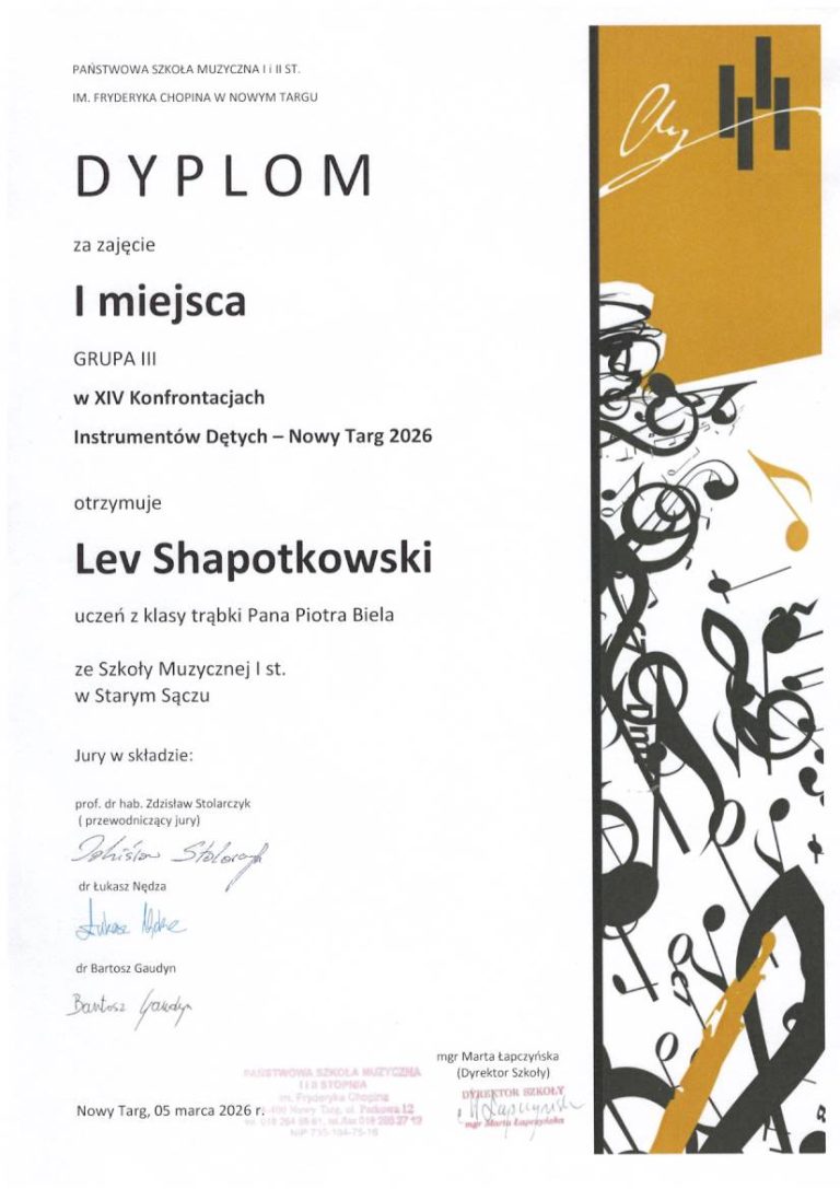 W dniu 05 marca 2026 r. w Państwowej Szkole Muzycznej I i II stopnia im. Fryderyka Chopina w Nowym Targu odbyły się XIV Konfrontacje Instrumentów Dętych – Nowy Targ 2026. Lev Shapotkovski z klasy III cyklu czteroletniego, którego nauczycielem prowadzącym jest pan Piotr Biel, zdobył I miejsce. Serdecznie gratulujemy uczniowi i jego…
