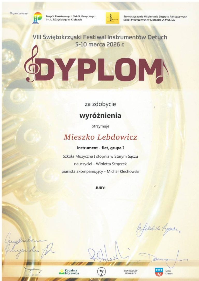 W dniach 05-10 marca 2026 r. odbył się Świętokrzyski Festiwal Instrumentów Dętych, w ramach którego miał miejsce ogólnopolski konkurs fletowy. Naszą szkołę reprezentował Mieszko Lebdowicz z klasy III cyklu sześcioletniego. Wśród niezwykle wymagającej konkurencji wywalczył wyróżnienie! Bardzo serdecznie gratulujemy Mieszkowi !!! Słowa uznania należą się…