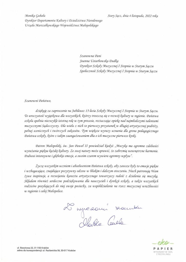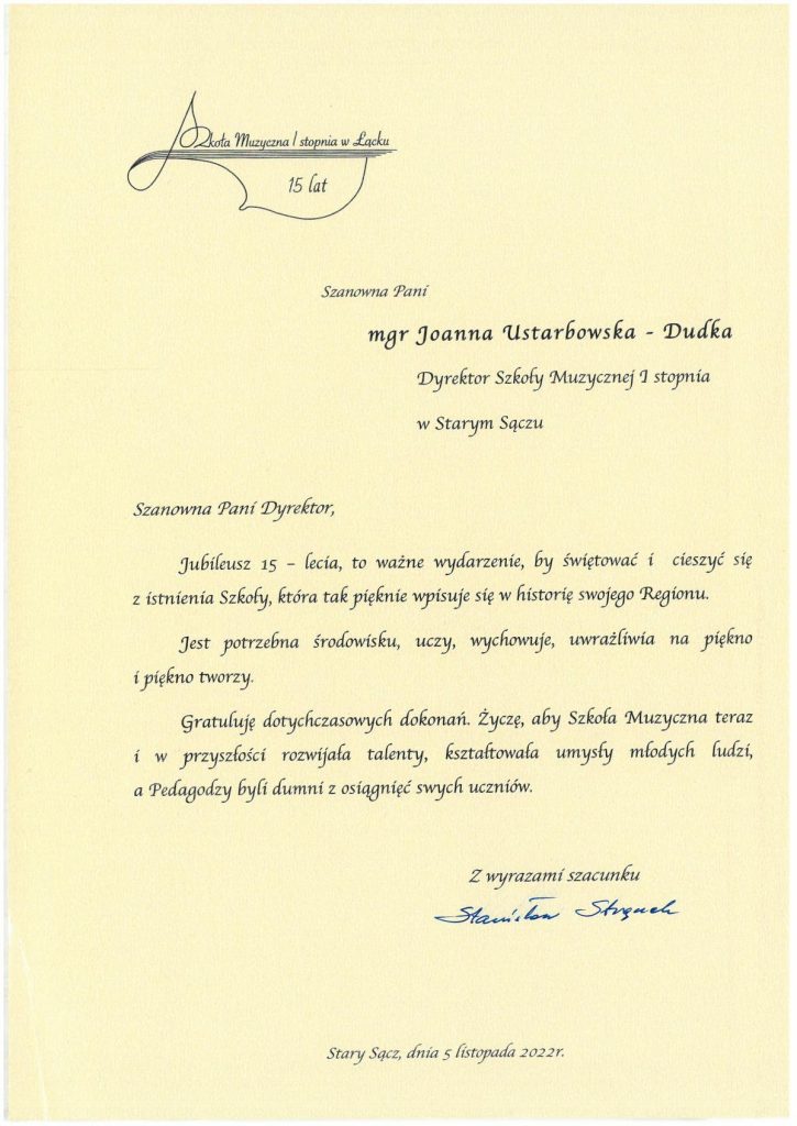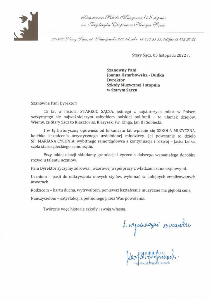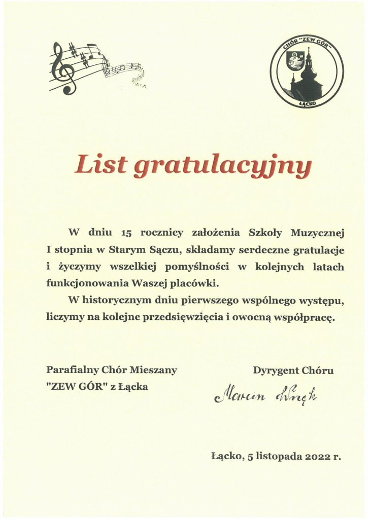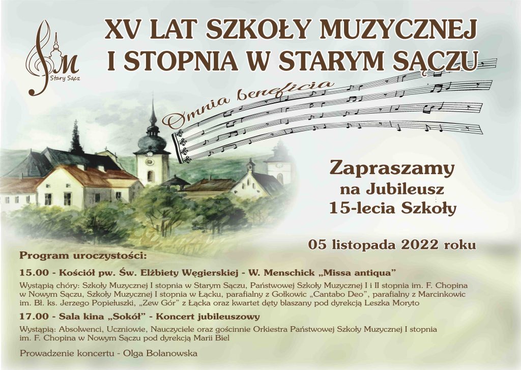 Serdecznie zapraszamy Państwa do oglądania fragmentów Mszy Świętej ,,Missa Antiqua”, która w dniu 05 listopada 2022 r. o godz. 15.00 w kościele parafialnym p.w. Świętej Elżbiety Węgierskiej w Starym Sączu rozpoczęła program obchodów 15-lecia Szkoły Muzycznej I stopnia w Starym Sączu oraz Koncertu Jubileszowego, który odbył się o godz. 17.00 w starosądeckim Sokole.
